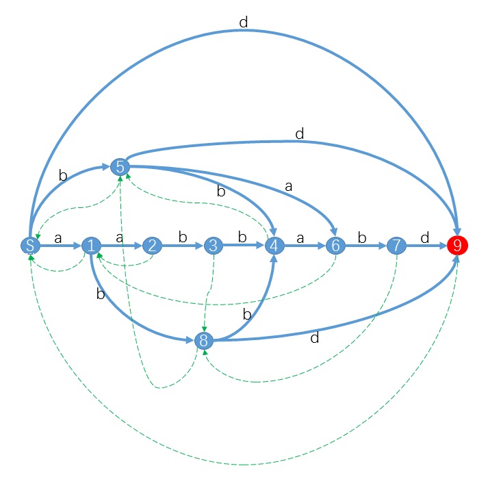 于是我们可以发现一条状态序列:7->8->5->S。这个序列的意义是 l o n g e s t ( 7 ) longest(7) l o n g e s t ( 7 ) 即aabbab的后缀依次在状态7、8、5、S中。我们用Suffix Link这一串状态链接起来,这条link就是上图中的绿色虚线。